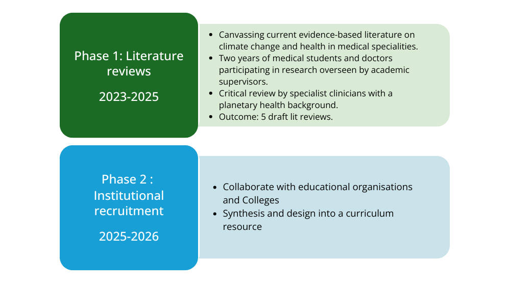 The project involves 2 phases: initially developing a series of specialty-specific literature reviews on climate change and health, followed by incorporating review findings into educational content and curriculum resources.